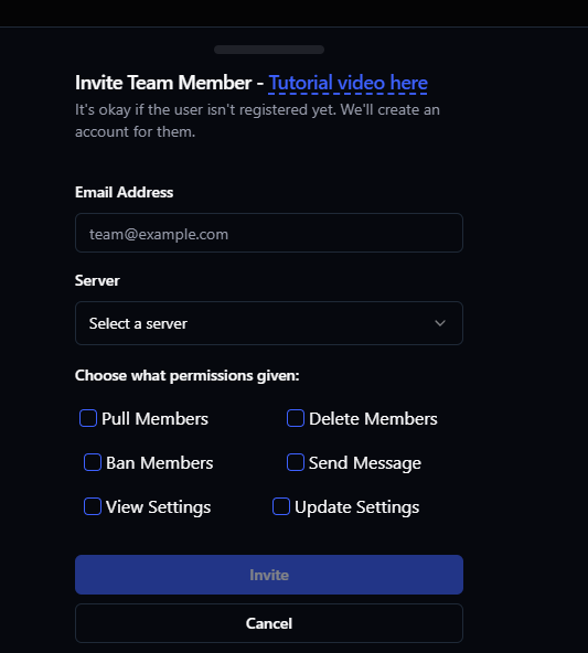 - Email Address: Enter your staff member’s email address. If they aren’t registered yet, VaultCord will create an account for them automatically.