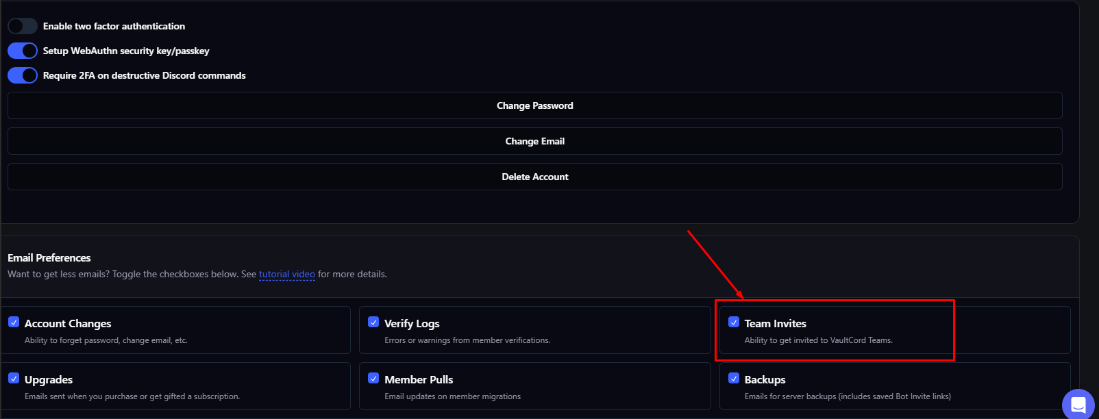 - Ensure that the Team Invites checkbox is Toggled ON (Ability to get invited to VaultCord Teams).