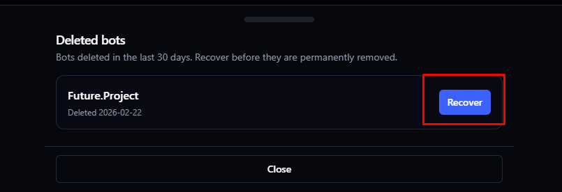 When you delete a server or bot from your dashboard, it is not erased right away.Grace Period: You have 14 days to recover your deleted items. After that, the data is permanently removed from our systems to protect your security and privacy.