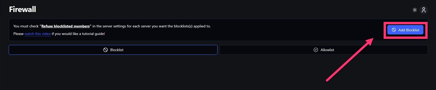 Add a blocklist on the Firewall page by clicking the Add Blocklist button.