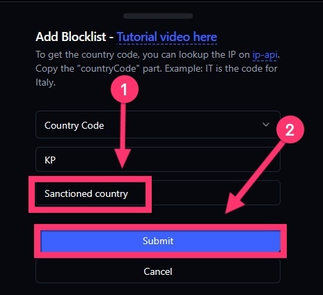 - Region Code (Country): Blocks by a two-letter country code (e.g., FR for France, ES for Spain). Find codes at ip-api.com.