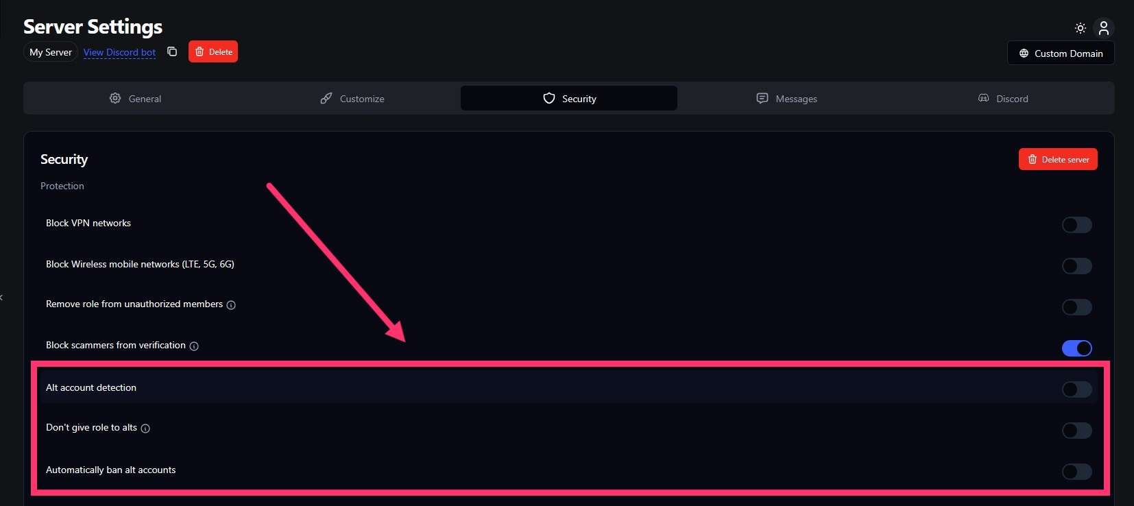 - Auto-ban alt accounts: Instantly bans detected alts from your server. Useful if VPN detection is off and you want to block repeated attempts.