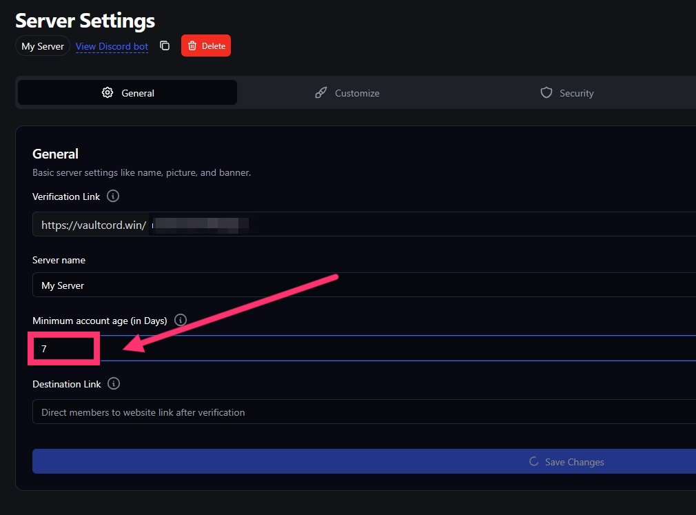 Go to your VaultCord server settings and scroll down. Find Minimum account age and set the required number of days an account must exist before joining. For example: 7 for 1 week, 30 for 1 month, or 365 for 1 year.