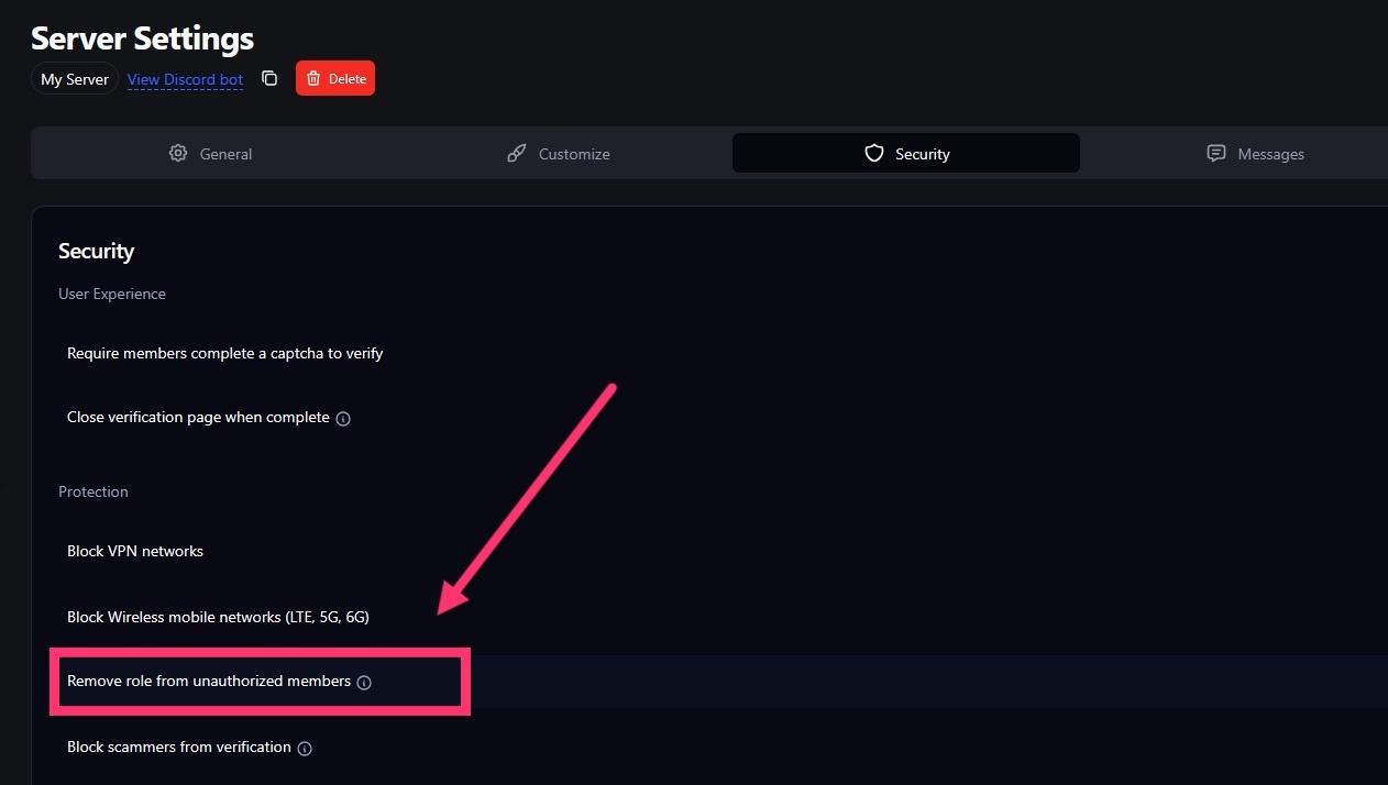 Within 5 seconds of a Discord account deauthorizing the application, VaultCord flags the user and allows you to remove their role, blocking their server access. To enable this, go to the Security tab in your VaultCord server settings and turn on Remove role from unauthorized members for instant role removal from deauthorized users. Why enable this? Users who unlink your verification system after joining are often suspicious and may intend harm. It’s safer to remove them from chat and send them back to the verification channel.